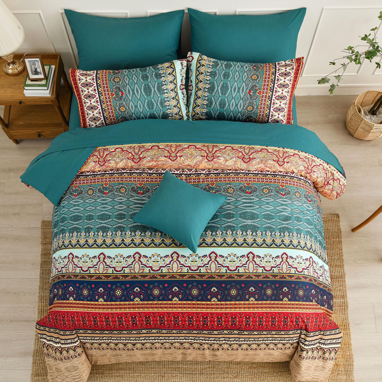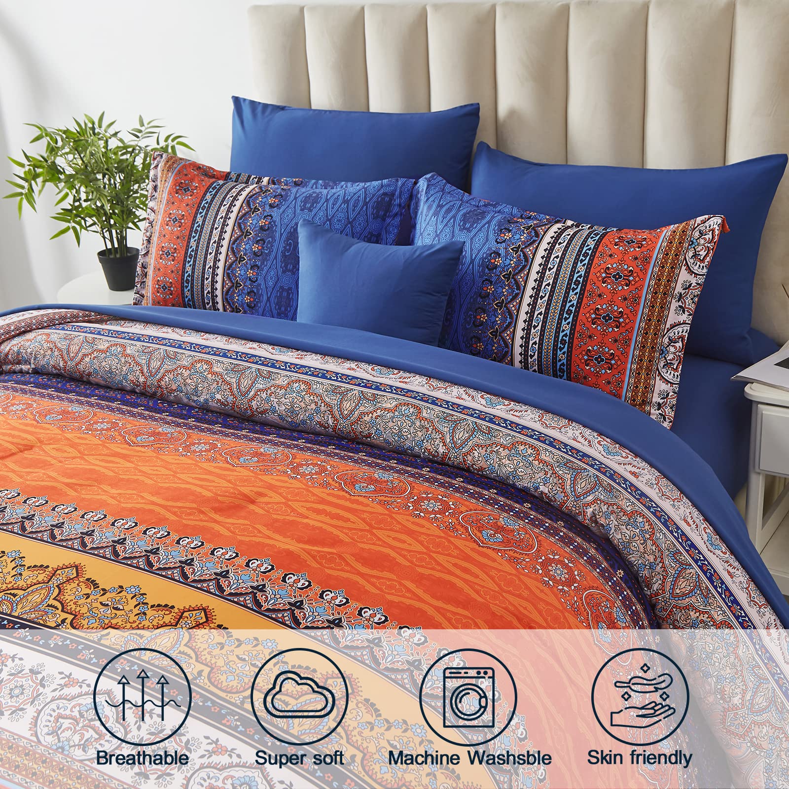 Este juego de edredón bohemio es super completo - trae 8 piezas para cama California King: edredón, sábana encimera, sábana bajera, 2 fundas de almohada estándar y 1 funda decorativa. El diseño en azul marino con motivos bohemios le da un aire fresco y moderno a tu dormitorio. Está hecho de microfibra suave tipo cachemira, super cómoda y ligera para dormir plácidamente. Viene prensado al vacío, así que al abrirlo déjalo al sol y dale unas palmaditas para que recupere su esponjosidad. Es lavable a máquina y no destiñe. Si buscas cambiar la ropa de cama con algo bonito, cómodo y fácil de cuidar, este juego bohemio es perfecto.